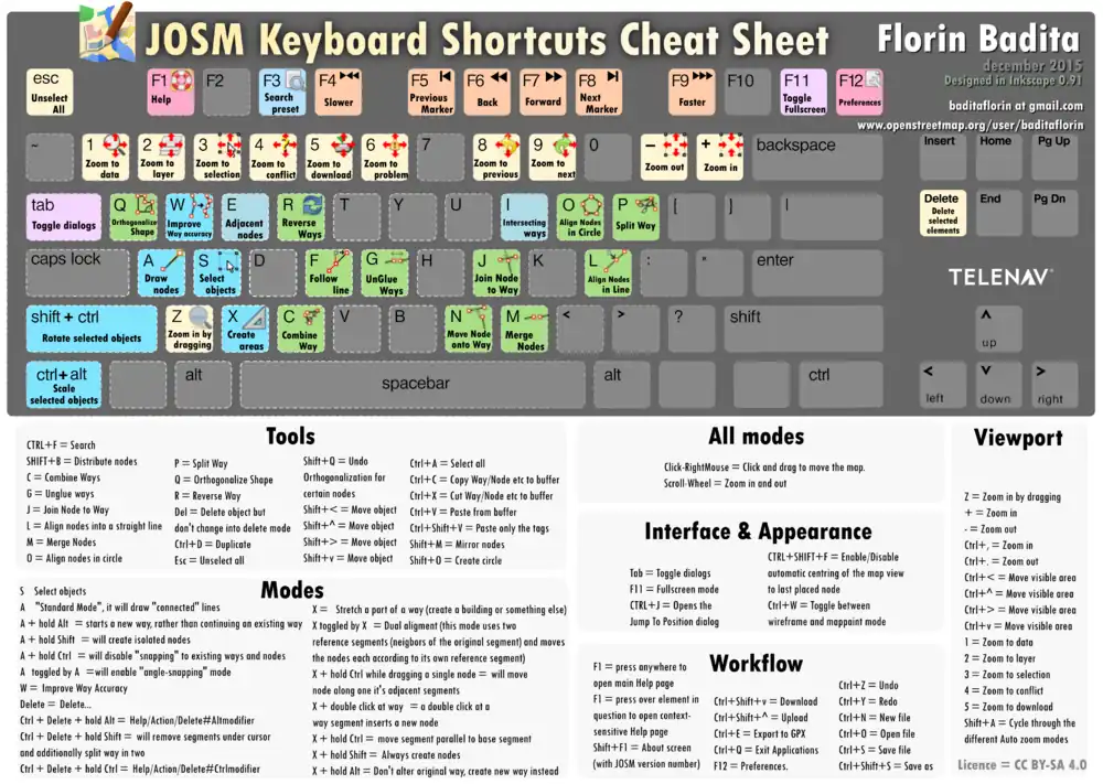 This page describes some basic ways of editing map data in JOSM. Basic editing assumes you have downloaded data and you know how to zoom and pan around Undo / Discard changesJOSM generally doesn't read or write data to the OpenStreetMap database except when you ask it to, but at any time before uploading, you can discard all your changes by closing down JOSM (or by deleting the active data layer). You can also undo individual editing actions by clicking the undo toolbar button ( If you upload erroneous changeset during your learning process, please contact other OSM members to assist you in questions and first edits not covered by this guide. But please be patient to study optional topics covered by this guide if you encounter problem, yes they are quite big, but you should find answer to your problem :-) (S)elect and (A)dd![]() JOSM Keyboard Shortcuts Cheat Sheet A3 300 DPI Printable version There are two main modes of operation when editing: