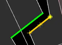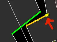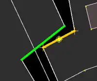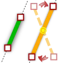 To be aligned segment selected- You will also notice yellow crosshairs on the two ends of the segment and in the centre of it. These are the potential rotation points or pivots that the segment can rotate around in order to become parallel with the reference segment. By default the centre pivot point is active and this is marked with the yellow dot-and-circle.