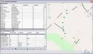 - Map area in the right area. It shows the position of the selected address(es) (orange) and the nodes of the selected street (green).