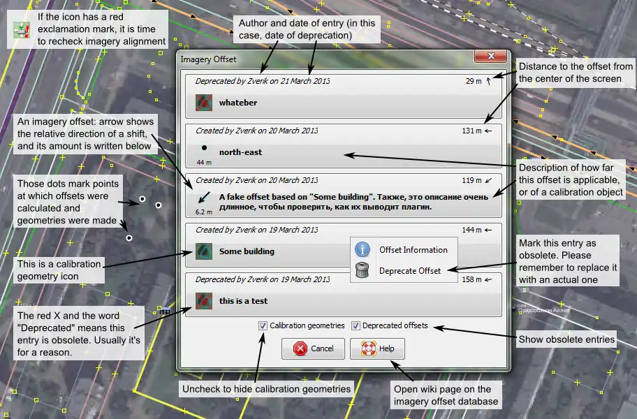 When you have started to upload all your offset bookmarks to the database, please don't forget to check their relevance (the imagery is updated often) and don't be lazy, write meaningful descriptions. Remember that OSM is a social project, and offset descriptions, as well as changeset ones, help others and rid you of pointless arguments.