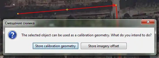 Let us add a new layer and draw a polyline on centerlines of intersecting objects. Then select it and choose the same menu item: "Store imagery offset". There we would be asked, what are we going to upload, calibration object or an offset:
