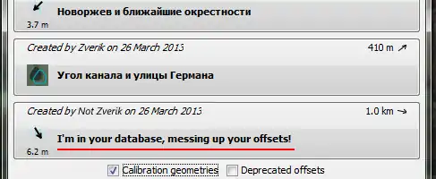 Sometimes someone adds an intentionally wrong offset, or an imagery is updated, or a calibration object suddenly becomes redacted on all imagery sources. This means we have to hide corresponding entries from the database. Open a context menu of an obsolete offset: