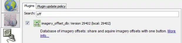 Let's start with installing the plugin. Press F12 (or a button with a cog), select the plugins tab, check the box for "imagery_offset_db" and apply the changed settings with "OK".