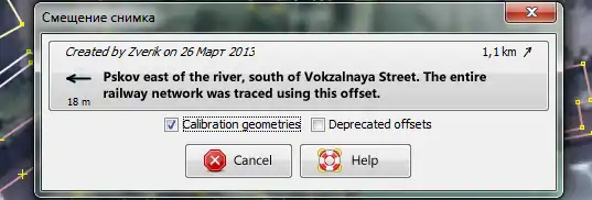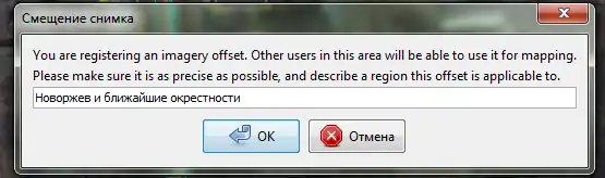 To upload the determined offset to the server, select the Bing Sat layer and choose the "Store imagery offset" menu item. You'd be asked only the description of an area, to which the offset is applicable. Note that this is not a name of a point where the offset was determined, but an area. The town in this example is small, therefore imagery offset is the same everywhere in it: