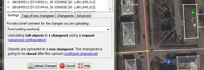 But wait, we forgot something. Buildings are still misaligned. We have to move them to correct positions, or else someone would "fix" our imagery offset using mapped buildings.