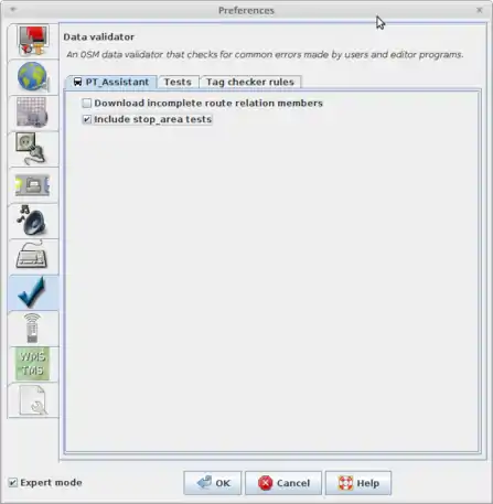- If you activate the "Download incomplete route relation members" option in the Preferences => Data Validator => PT_Assistant) while working on a large dataset, select the desired route relations before validating, otherwise the download of incomplete members may take too long.