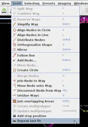 - Open the "Command Stack" window in JOSM, especially if you are using the automated fixes for route-segment-related warnings ("PT: Problem in the route segment..."). It will help you see which changes have been carried out and revert them if necessary.