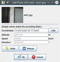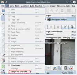 GPS related properties of the selected photo can be edited with the GPS data editor. Open the editor with Edit photo GPS data in the JOSM Edit menu.