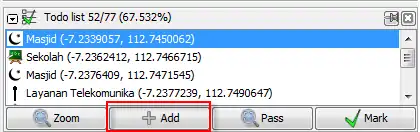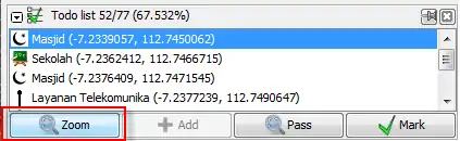 Once you have built up a list of items that need attention you can either select one from the list and zoom to it with the Zoom button (or simply double click on the entry in the todo list). After examining the object in question and optionally editing it as necessary, you can mark the object as finished by clicking the Mark button on the todo panel (make sure you have the correct object selected in the todo list as it is the selected entry there that is marked, the selection in the main editor window is ignored).