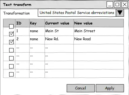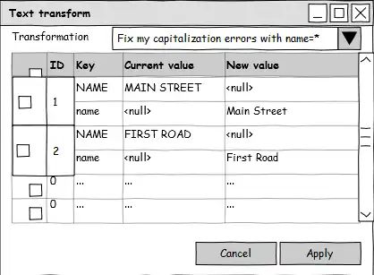 The GUI mockups above give an indication of what the dialog would look like. The plugin will only consider selected objects, so we can take advantage of all the powers of JOSM's built-in search tool. "Transformers" will themselves be plugin-like, or at the very least implement a common base class. A simple signature might be OsmObject transform(OsmObject input), as it could then perhaps automatically filter by region, or ignore objects with a certain ID number, last author, version, etc.