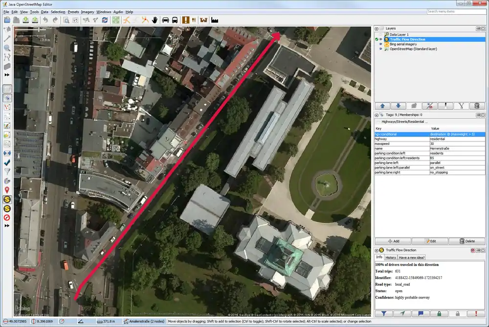 An arrow will show you the suggested correct direction, and you can use "R" to change the way direction. You can choose between different confidence levels about our suggestions, based on number of trips through that segment.