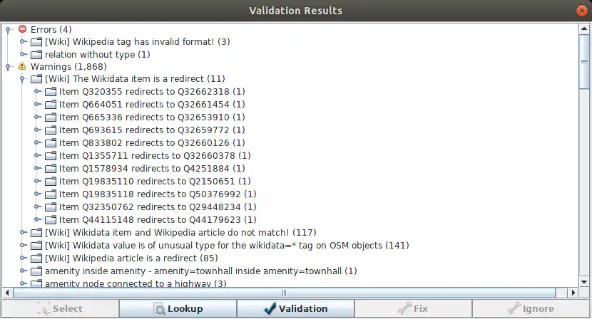 - add validator check that the item from the wikidata=* tag really exists. If the item is a redirect, an autofix is offered.