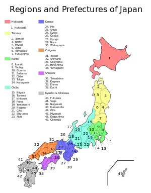 Map of the prefectures of Japan in ISO 3166-2:JP order and the regions of Japan.
