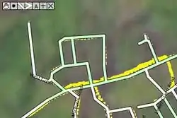 Green lines represent lines that have already been drawn in but do not yet form part of a way, and black dots are nodes. White lines represent line segments that have been made into part of a way. A red node shows the currently active node (e.g. when drawing lines).
