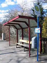 Bus stop platform with a waste basket, shelter and bench (picture on right):