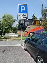 Women's parking space is typically closer to an entrance, and are sometimes larger than other spaces.