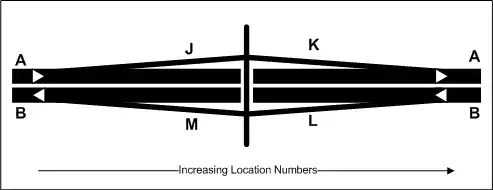In the United Kingdom the main carriageways of a road are usually designated "A" and "B", with the off sliproad from the "A" side being "J" and the on sliproad being "K", with "L" and "M" being used for corresponding "B" carriageway sliproads. "C" and "D" are used for where motorways or other divided highways have collector/distributor lanes, e.g. the M20 near Maidstone or M60 around Manchester. Some more complicated junctions use other references.