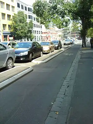 class:bicycle:roadcycling=-2 cycleway=track & highway=tertiary/secondary Very dangerous to ride quickly here as separated from street behind cars, but has to be used by law. Riding fast is not possible. Nice for the "Sunday cyclist" though.