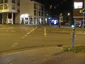 The bicycle crossing traverses two carriageways and some tram tracks with one traffic light. The pedestrian crossing has two islands with separate traffic lights.