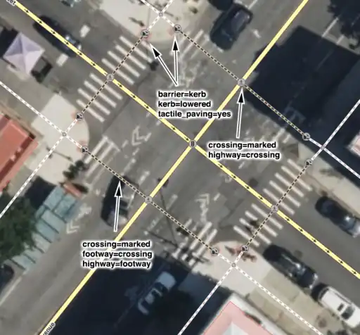 Preferred method for tagging a marked crossing as a way with kerbs.