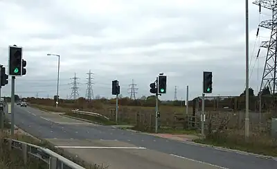 May be found to give priority to public transport, emergency or special vehicles, when they enter/exit an access service highway (e.g. in first image).