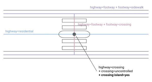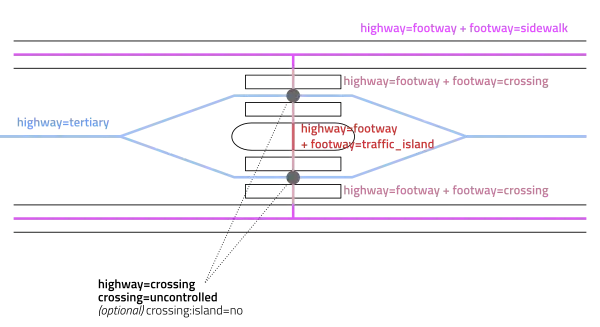 - footway=traffic_island – Used by some mappers for the part of the highway=footway that is on the traffic island, instead of using crossing:island=yes (at places where sidewalks and pedestrian crossings are mapped as ways).