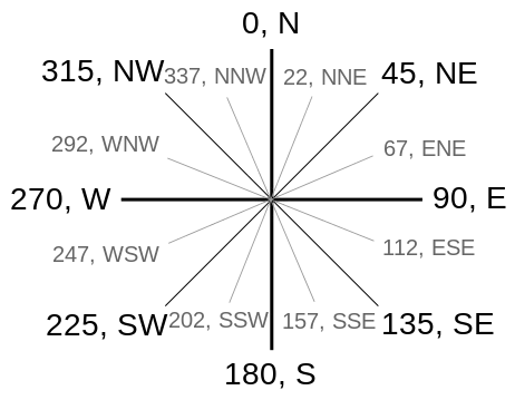 This image shows all possible values for cardinal directions together with the corresponding degrees.