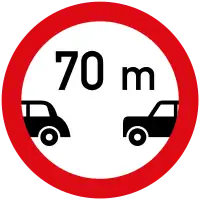 Tag the roadway subject to the restriction with mindistance=##, where ## is the minimum number of meters on the sign, for example mindistance=50 for a 50-metre (160 ft) minimum distance. In regions that measure road distances in non-metric units, specify the unit explicitly, for example mindistance=30'6" for a 30-foot-6-inch (9.30 m) minimum distance.