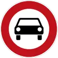 A separate prohibitory sign that especially for passenger cars is not included in the Vienna Convention and is also absent in the legislation of most joining countries (absent in 19 of the 20 European countries with separate information in this overview , with the notable exception of Germany). The Vienna convention makes no distinction between the usage of frontal or sideways silhouettes in prohibitory signs on which a different meaning – such as in the German exception – could be based.