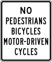 In many U.S. states, state law technically distinguishes between expressways and freeways (i.e., motorways) but does not formally tie the expressway classification to a set of access restrictions. Instead of the motorroad symbol sign used in many Vienna Convention countries, the MUTCD specifies a "selective exclusion sign" that explicitly lists the prohibited modes of transportation. The exclusions can differ between two expressways in the same state, so always add explicit access tags according to the specific exclusions on the sign posted at entrances to the expressway. Despite the absence of classification-based access restrictions in the U.S., motorroad=yes has sometimes been applied in addition to the access tags on various highway=trunk and highway=primary ways, which typically happen to be expressways.