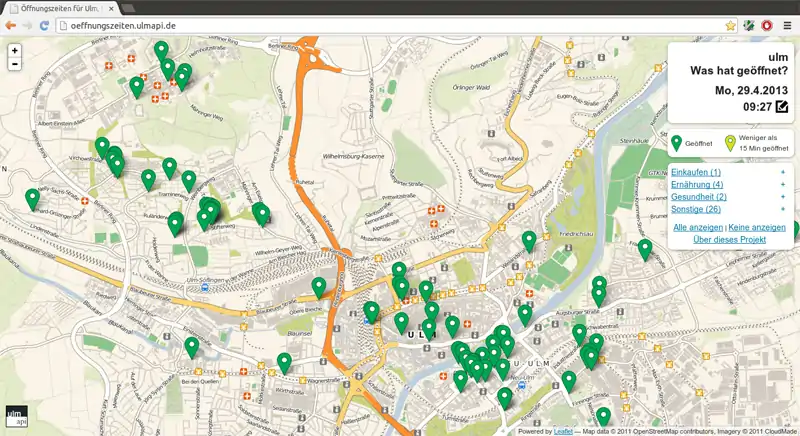 The web application is available on http://ulm-oeffnungszeiten.creal.de. Opening hours for the local area are visualized on a map. The source code of this application is freely licensed and available via GitHub. Adapting the application to a different city is very easy and described on the GitHub page.