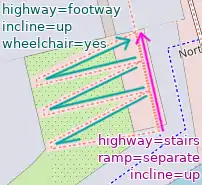 | ramp:stroller=yes | A pair of ramps with a narrow flight of stairs in the middle that allows a stroller (and bicycles too) to be pushed up the stairs. | ![]() |