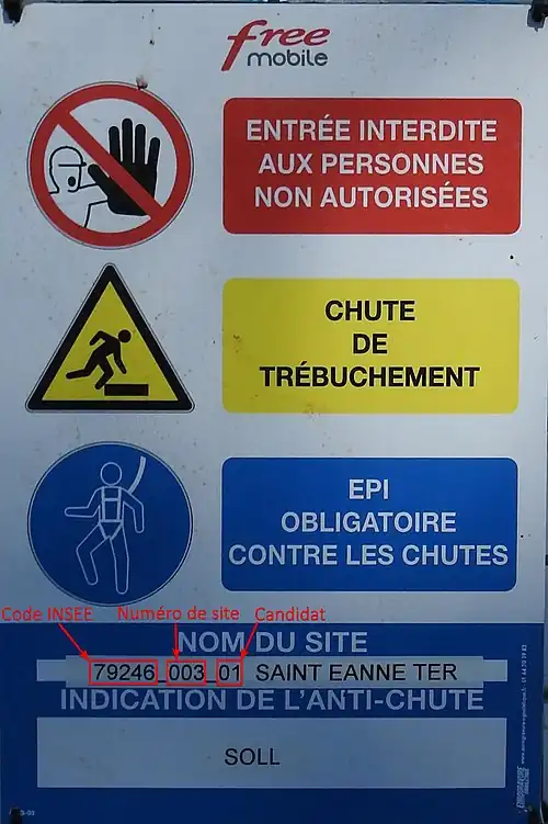 French mobile antennas hosting Free Mobile's mobile telephony equipment (3G / 4G /5G) are generally identified with a "Site Code", an identifier specific to the Free Mobile company and nationally unique.