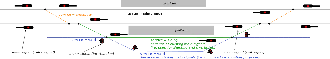 - service=siding for tracks not described above. These will be tracks not used for normally scheduled passenger service, including diversion-only tracks, emergency, non-revenue trackage, as well as turn tracks not used in scheduled service. Example in Berlin: 153424828