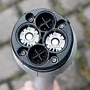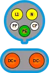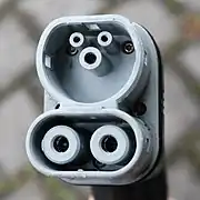 IEC 62196-2 Type 1 or SAE J1772-2009 combined charging system (CCS) plug, with 2, larger, extra pins for DC charging.