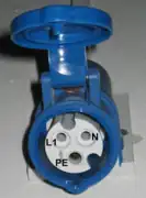 cee_blue Industrial Germany IEC 60309 P+N+E, 6h earth pin, blue, 220–240 V AC, 16 A, colloquially known as CEE blue or "caravan socket". Commonly used for power supply in camping sites in Europe.