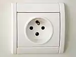 Domestic socket used in France, Belgium, Monaco, Morocco, Tunisia, Poland, Czech Republic, Slovakia. IEC type E, or CEE 7/5 socket (taking a CEE 7/6 or CEE 7/7 plug), 220–230 V AC, 16 A. Can be compatible with schuko by additionally having connectors at the sides.