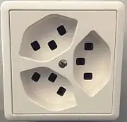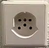 IEC type F, or CEE 7/3 socket (taking a CEE 7/4 plug), also known as Schuko (or Siemens in Italy), 220–240 V AC, 16 A. Developed in Germany, used in most European countries and some in Africa and Asia. Can be compatible with typee by additionally having a pin/hole on the front side.