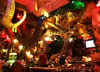 Hard Rock Cafe. Which feature extensive use of rock memorabilia in its décor. Note that many restaurants are likely be themed appropriate to their cuisine=*.
