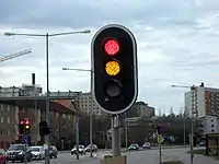 - traffic_signals=bus_priority / traffic_signals=tram_priority - Normally off or blinking yellow and changes to red to give priority to a bus or tram. If it is turned off in normal state, it may first blink yellow before changing to red. At some places it has only two lamps (yellow and red) instead of three. In other regions, all states are white with different shapes conveying priority.
