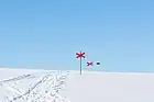 Trail marking made by erected poles wooden or plastic, colored or natural. If poles for example having red crosses on top for better vissibility |