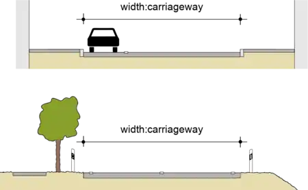 It's helpful to use width:carriageway=* in addition to width=* on road objects, because it is controversial how to define the width of roads if the road includes elements such as sidewalks, parking lanes, shoulders etc. For the specification of road widths, see also the chapter width of streets.