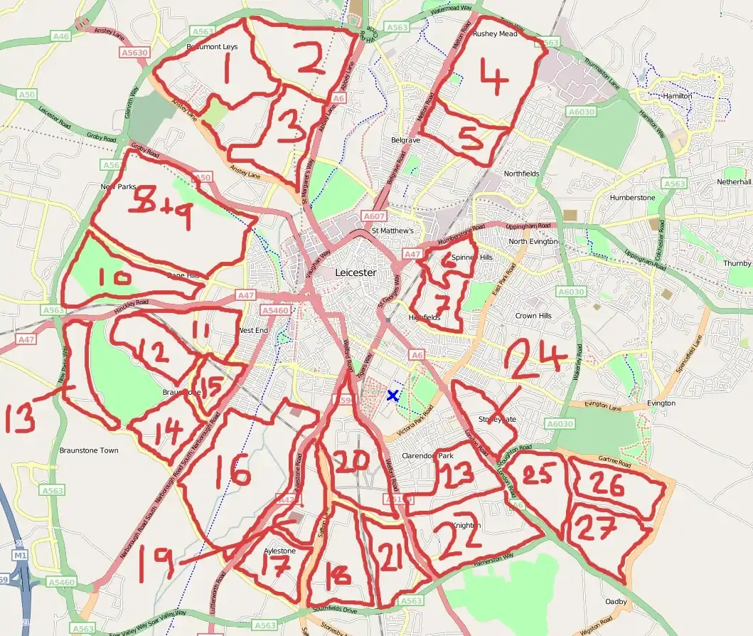 At the moment the centre of the town is done, and those parts that are done are very well done, however massive gaps are clearly visible in Highfields, Claredon Park, Knighton etc. The main aim of this mapping party is to get all areas close to the city centre. Main areas to be completed are