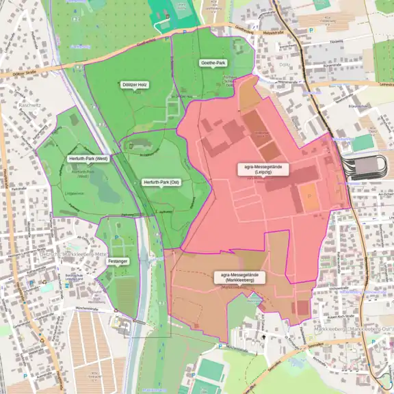 agra-Park (grünlich) und agra-Messegelände (rötlich gefärbt)
