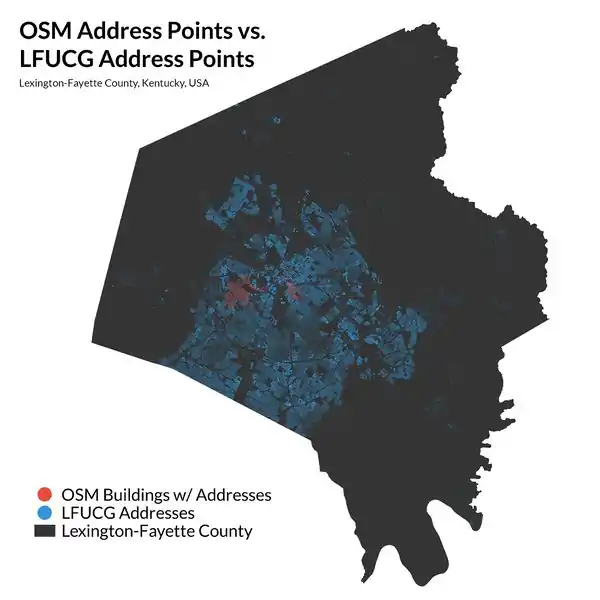 There are not a lot of buildings already in OSM for Lexington, KY. As of February 2016 there are just over 7,000, which is about 5% of the total. Where there is overlap, we will preserve the OSM edits, unless the city data is obviously better on a case by case basis.