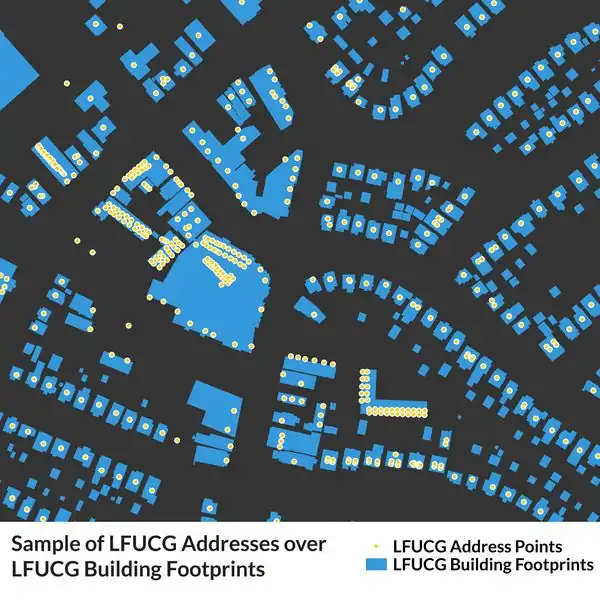 Sample of LFUCG address data overlayed on LFUCG building data. For single-address buildings, addresses are centered over the center of the building footprint, if there is a building. Then they are centered on the parcel (parcels not shown in this image). In the case of condos, they are stacked and slightly offset.