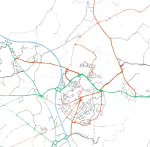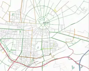 The geometric layout of Karlsruhe is illustrated in SlowRider's map, rendered by Joto using Osmarender |