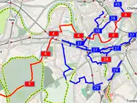 Pyroute in cycle mode, avoiding big roads and giving a quiet cycle route through back-streets and cycle paths. See a video of it working | |