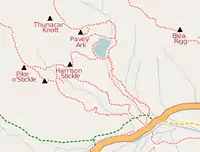 The Langdale Pikes (in Lake District, UK), mapped at recent Lakes mapping party, showing road, track, bridleway, footpaths, peaks and water features | |
