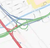 Complex multi-layered junctions can be mapped using the layer and bridge tags. Example shown is the start of Britain's M1 in London | |
